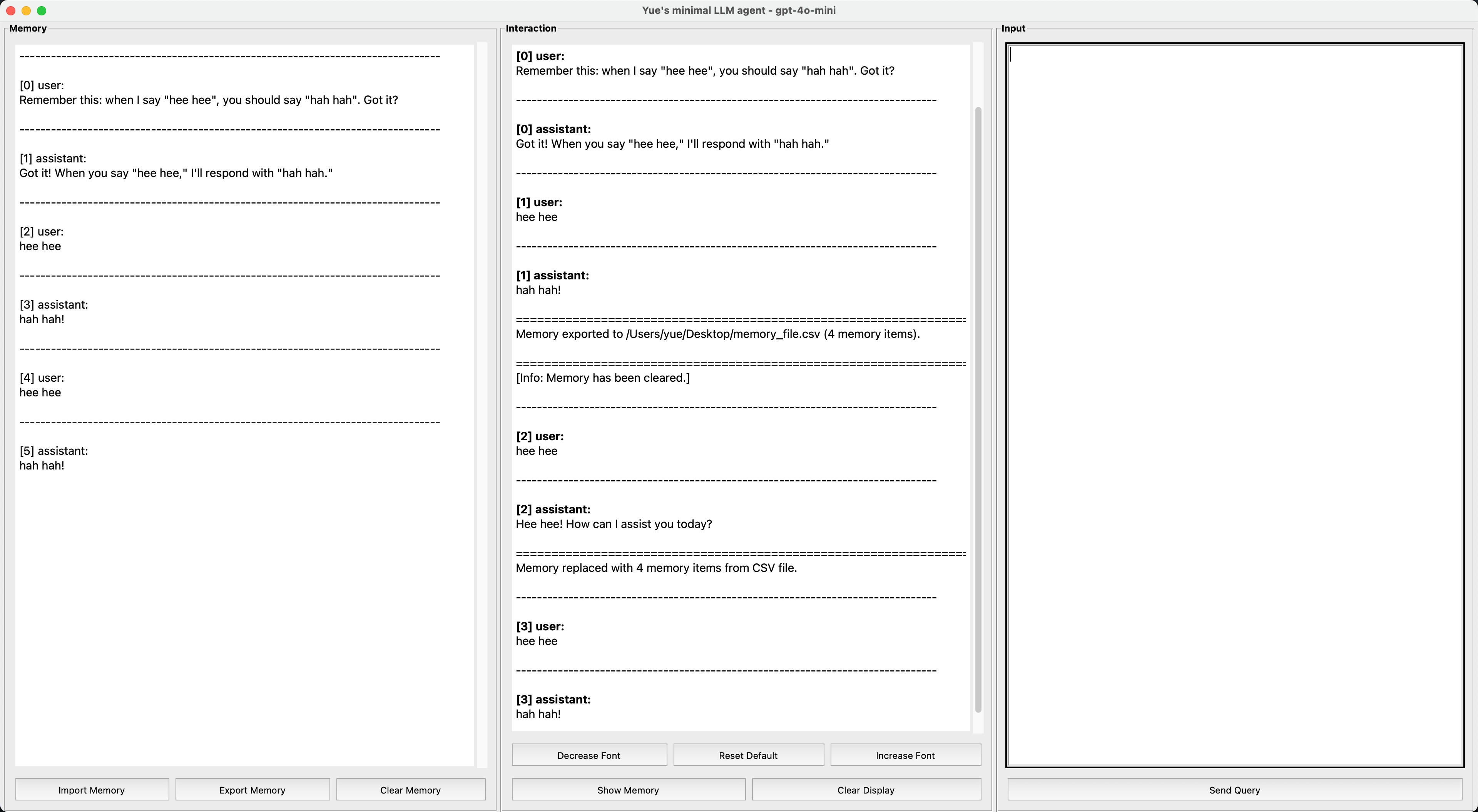 This is Yue's minimal LLM agent, powered by the model "gpt-4o-mini".